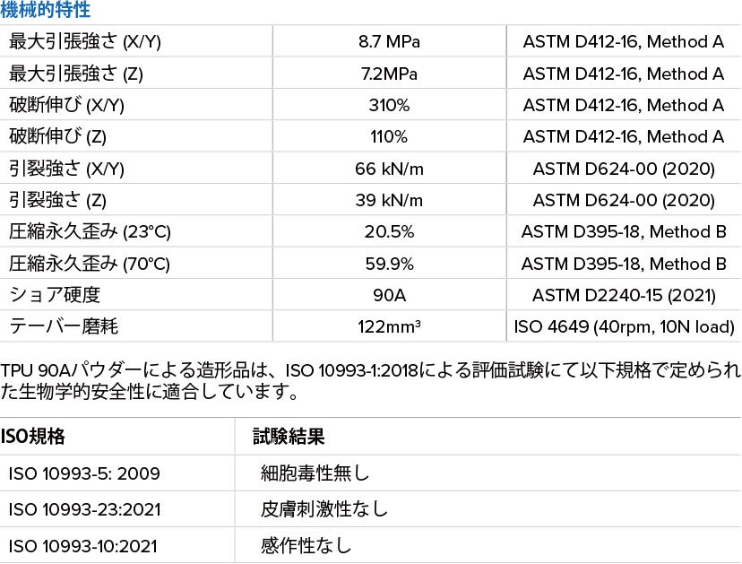 TPU 90Aパウダーは、90AのショアA硬度を持つ硬質かつ高強度な軟質材で、高い破断伸びと引裂強さを備えています。また、 本材料はISO 10993-1:2018に基づく生物学的安全性評価において下記の生体適合性が確認されています。