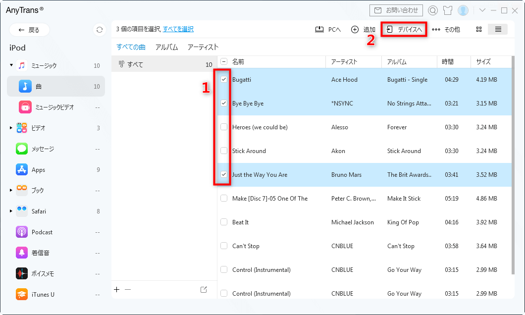 Step 3: iPodに保存している曲が一覧表示されます。iPhoneへ移したい音楽を選択 > 右上にある「デバイスへ転送」ボタンをクリックしてください。