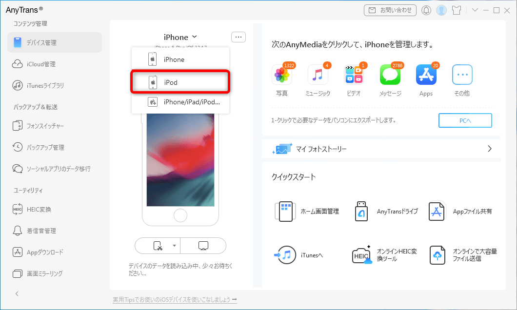 Step 1: iPodとiPhoneを共にパソコンに接続して、AnyTransを立ち上げます。iPodからiPhoneへ転送する場合、iPodを選択します。iPhoneからiPodを移行する場合、iPhoneを選択します。