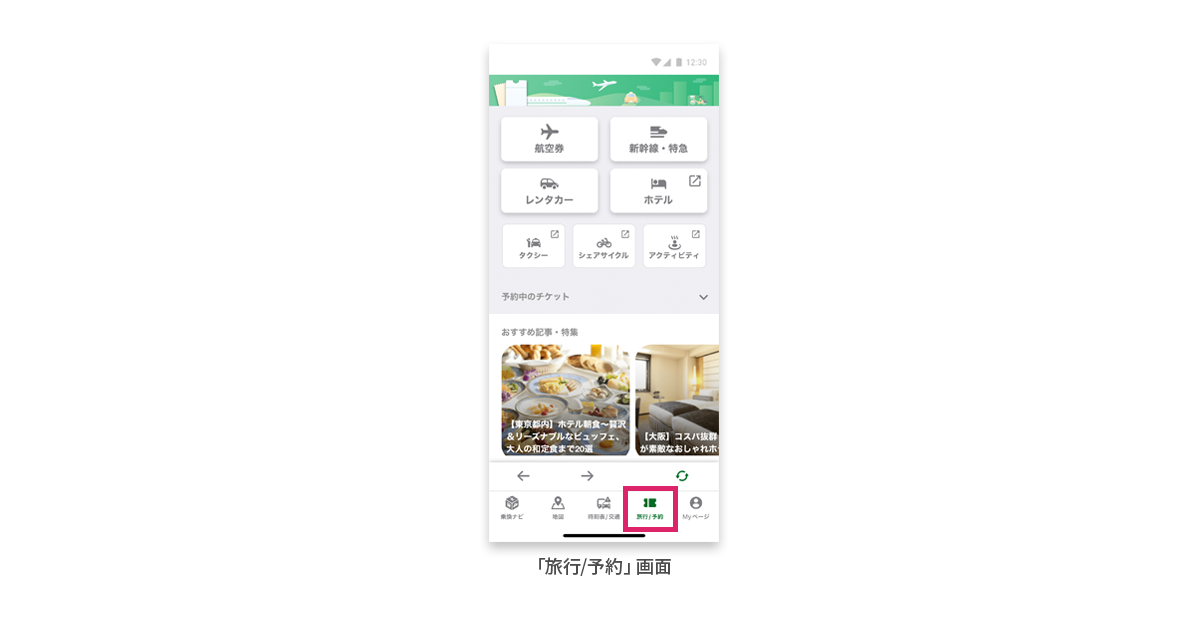 画面下部に「旅行/予約」ボタンを新設し、従来のルート検索結果からの導線に加えて「旅行/予約」からも、タクシー配車や、飛行機・新幹線・レンタカー・シェアサイクルなど移動手段やホテル、アクティビティ等の予約と予約確認が可能になりました。ルート検索から予約まで、移動に関わるあらゆる機能をひとつのアプリ内で利用しやすくなりました。