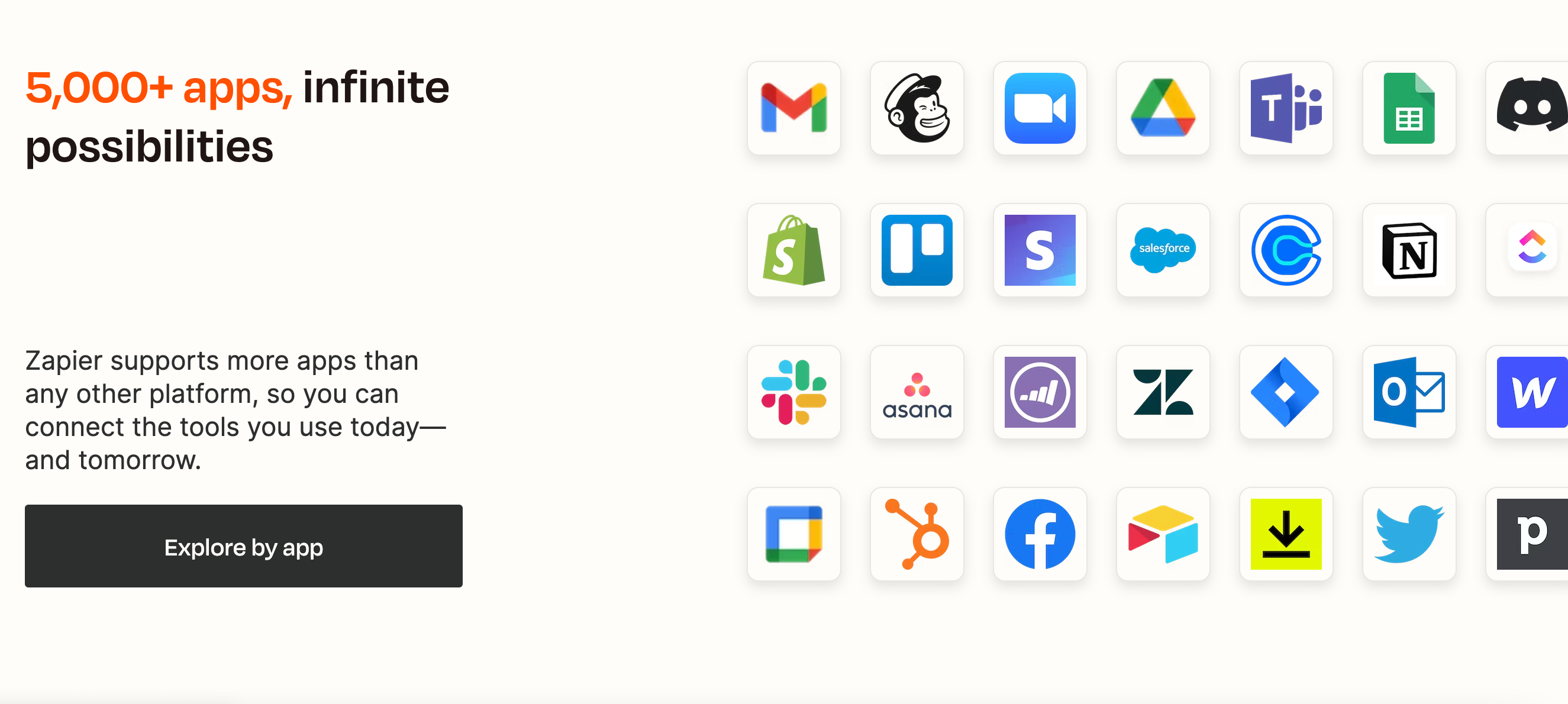 Zapierは、アメリカ発祥のタスク自動化ツールであり、異なるアプリやWebサービス同士を連携させてタスクを自動化することができます。Zapierは2012年にリリースされ、2023年現在では5,000種類以上の対象サービスにまで拡大しています。