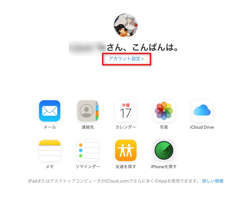 Step 3.それで、このようにすべてのiCloudの機能のアイコンが表示されました。「アカウント設定」をクリックします。