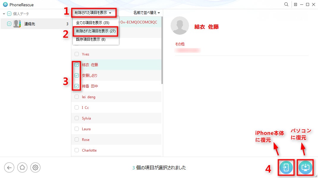 Step 4.「削除された項目を表示」を選択 > 消えた連絡先をプレビューして復元したい連絡先を選択 > 連絡先をiPhone本体に戻したい場合、iPhoneアイコンをクリックしてください。パソコンに保存したい場合、パソコンアイコンをクリックしてください。