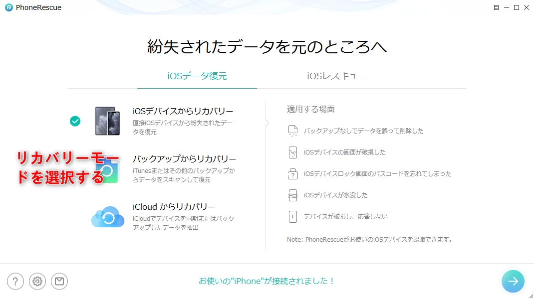 PhoneRescueは3つの対策を提供している:iOS端末本体/iTunesバックアップ/iCloudバックアップから復元
