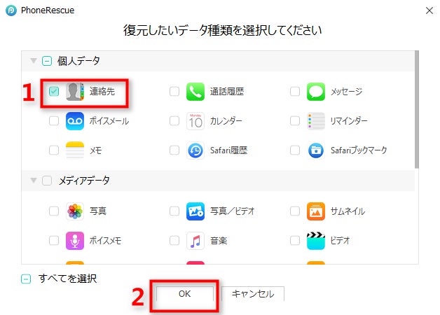 Step 3.「連絡先」を選択して、「OK」をクリックします。PhoneRescueは復元可能の連絡先をスキャンします。