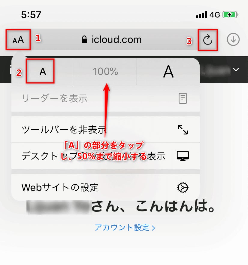 Step 2.iPhoneの場合は縮小しないとすべての機能が表示されないので、「iPadまたはデスクトップコンピュータのiCloud.comでさらに多くのApp使用できます。」と表示されます。そこでURL入力欄の左横にある「AA」をタップします。ページの拡大率を50%まで縮小します。
