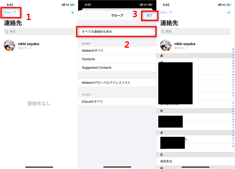 Step 2.左上の「グループ」を押して、「すべての連絡先を表示」をタップしてください。そして「完了」をタップすると、すべての連絡先が戻ります。