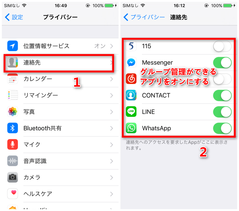 3 .プライバシー設定で連絡先のグループ管理ができるアプリをオンにする