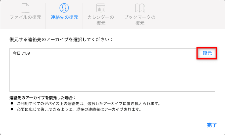 Step 5.復元する連絡先のアーカイブを選択して、その右横にある「復元」をクリックします。