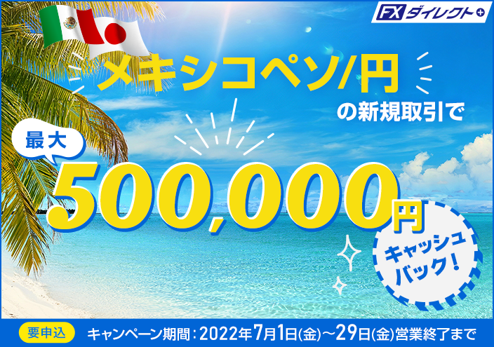 キャンペーンに申し込まれたお客さまに、期間中におけるFXダイレクトプラスでのメキシコペソ/円の新規取引合計数量に応じて、最大500,000円【新規取引1万通貨ごとに2円】をキャッシュバックします。