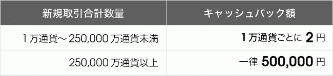 ・新規取引合計数量が5,000万通貨 ⇒ 10,000円キャッシュバック