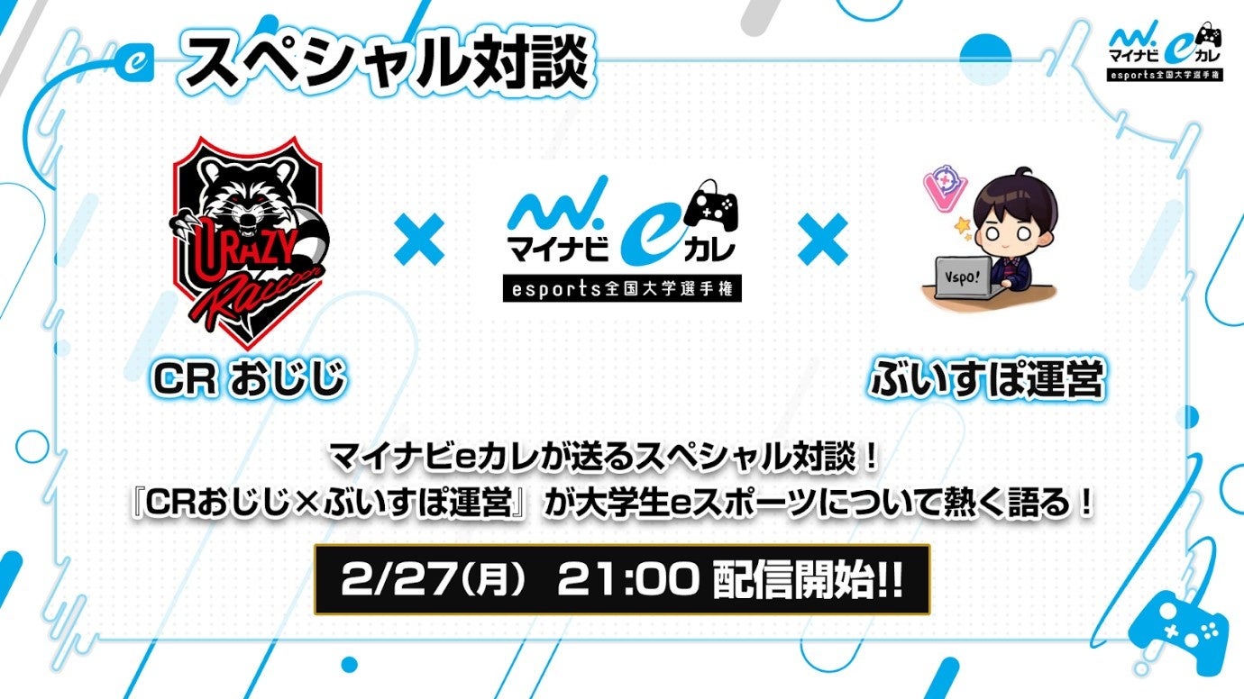 日本esports界を牽引するCrazy Raccoon代表のおじじ氏と、VTuber×esportsを確立させた『ぶいすぽっ!』の運営によるスペシャル対談を実施しました。『マイナビeカレ』はもちろんのこと、今後の大学生esportsシーンを盛り上げるために必要なことや、大学在籍中にアツくなったものがesportsであることを誇りに思えるようにするには、などについて熱く対談しました。