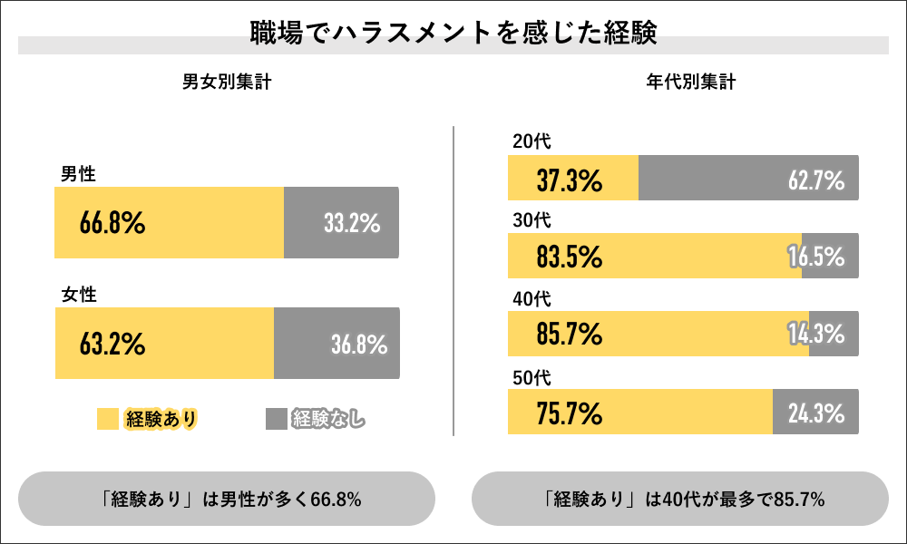 ハラスメントを感じた経験を男女別で見ていくと、「経験あり」の男性が66.8%で、女性は63.2%でほぼ差がない結果でした。また同じく「経験あり」を年代別で見ていくと、40代が85.7%で最多回答になり、次いで30代が83.5%、50代が75.7%、20代が37.3%で、20代が最も少なく、他年代は8割前後と高い割合になりました。
