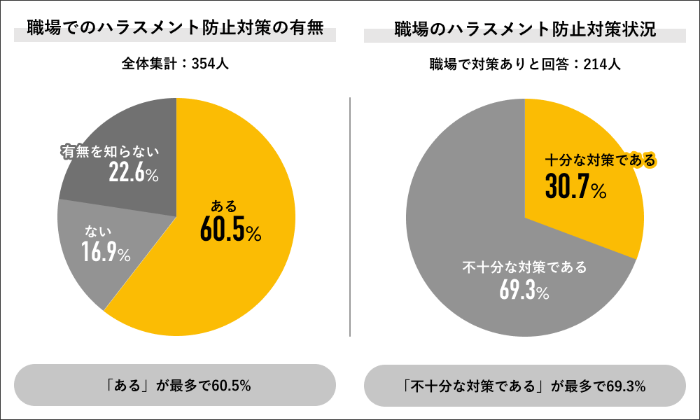 回答者全体の354人に職場のハラスメント防止対策の有無を聞くと、「ある」が60.5%で、「ない」が16.9%、「有無を知らない」が22.6%でした。また防止対策ありを回答した214人にその満足度を聞くと、69.3%が「不十分な対策である」を回答する結果になりました。