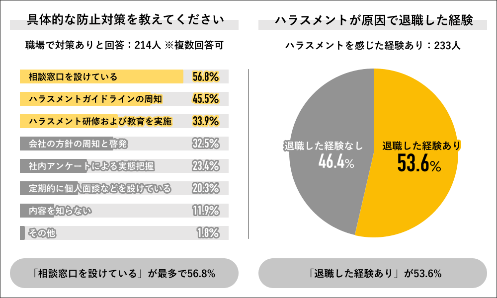 防止対策ありを回答した214人に具体的な防止対策を聞くと、「職場で相談窓口を設けている」が56.8%で最多回答になり、次いで「ハラスメントガイドラインの周知」が45.5%、「ハラスメント研修及び教育の実施」が33.9%で上位3つの回答結果になりました。またハラスメントを感じた経験のある233人にハラスメントが原因の退職経験有無を聞くと、「退職経験あり」が53.6%で、「退職経験なし」が46.6%になり、半数以上がハラスメントの影響で退職に追い込まれている結果になりました。