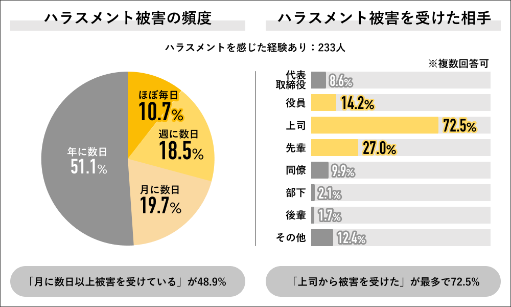 ハラスメントを感じた経験のある233人に被害の頻度を聞くと、「ほぼ毎日」が10.7%、「週に数日」が18.5%、「月に数日」が19.7%で、合算した48.9%がほぼ毎日から月に数日被害を受けていることがわかりました。年に数日は51.1%で最多回答でした。