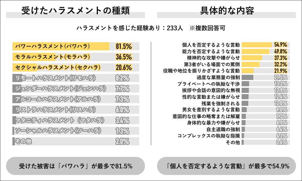 ハラスメントを感じた経験のある233人に被害の種類を聞くと、「パワーハラスメント(以下パワハラ)」が81.5%で圧倒的に多く最多回答になり、次いで「モラルハラスメント(以下モラハラ)」が36.5%、「セクシャルハラスメント(以下セクハラ)」が20.6%で上位3つの回答結果でした。また具体的な内容を聞くと、「個人を否定するような言動」が54.9%で最多回答になり、次いで「能力を否定するような言動」が49.8%、「精神的な攻撃や嫌がらせ」が37.3%で上位3つの回答結果でした。