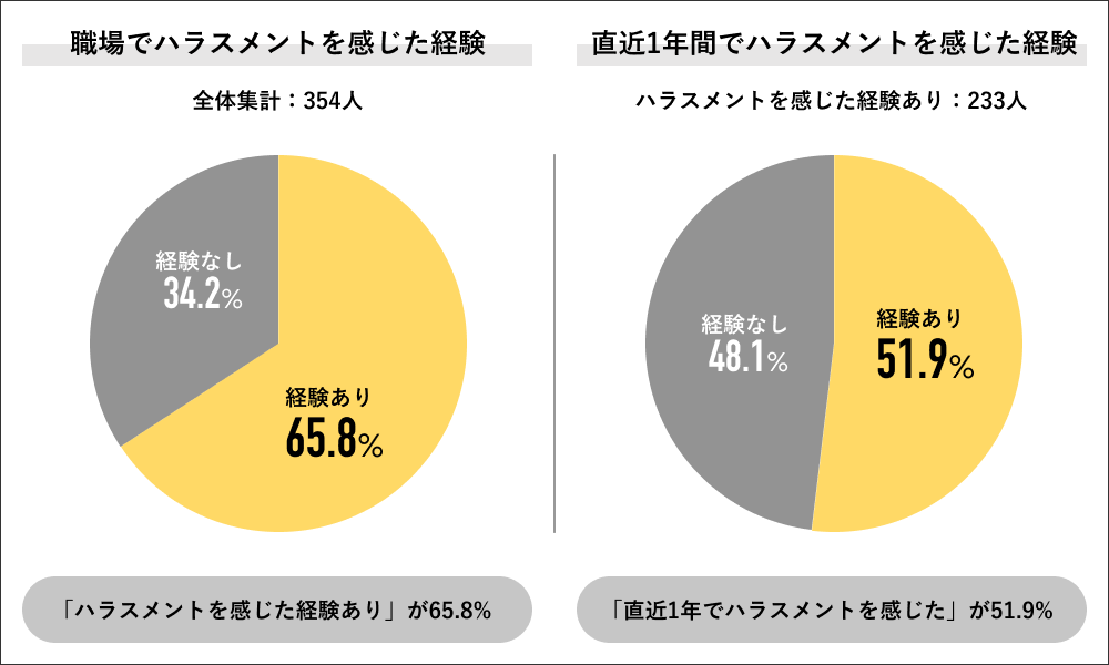 回答者全体の354人に過去職場でハラスメントを感じた経験について聞くと、全体の65.8%が「経験あり」を回答し、「経験なし」は34.2%でした。また過去ハラスメントを感じた経験のある233人に直近1年間でハラスメントを感じた経験を聞くと、「経験あり」が51.9%で、「経験なし」は48.1%の結果になりました。