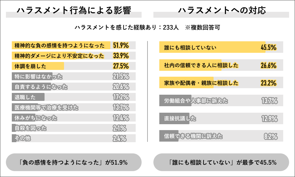 ハラスメントを感じた経験のある233人に被害による影響について聞くと、「精神的に負の感情を持つようになった」が51.9%で最多回答になり、次いで「精神的ダメージにより不安定になった」が33.9%、「心身ともに体調を崩した」が27.5%で上位3つの回答でした。いずれも精神的なダメージの影響に関する回答結果になりました。また被害についての相談相手を聞くと、「誰にも相談していない」が45.5%で最多回答になり、次いで「社内の信頼できる人に相談した」が26.6%、「家族または配偶者や親族に相談した」が23.2%で上位3つの回答結果になりました。「直接話した」は12.9%でした。