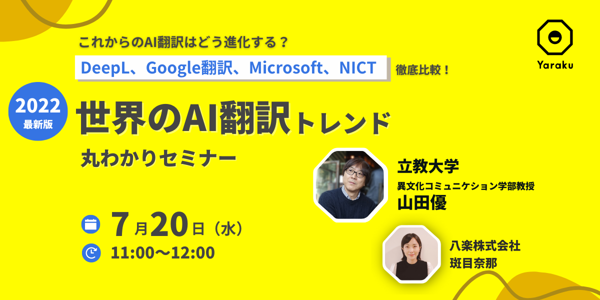 今回のオンラインセミナーは、主要4大翻訳エンジン(DeepL、Google翻訳、Microsoft、NICT)の特徴、文書の種類ごとにどの翻訳エンジンを選ぶのが最適なのか等、二部制で情報をお届けします。第一部ではAI翻訳研究の第一人者である立教大学教授の山田優が、2022年時点における自動翻訳の実力について解説。第二部では4大翻訳エンジンの結果を同時に比較可能なAI翻訳ツール「ヤラクゼン」についてご紹介します。