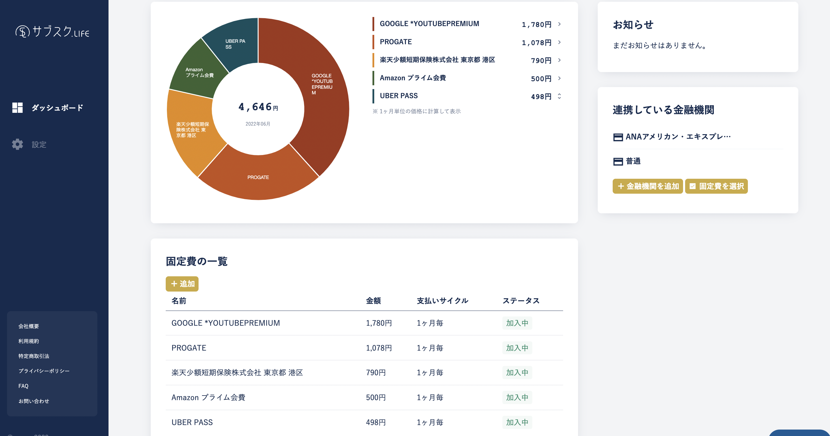 サブスク.LIFEの1つのマイページで、固定費に関するあらゆる管理ができるサービスを目指しています。