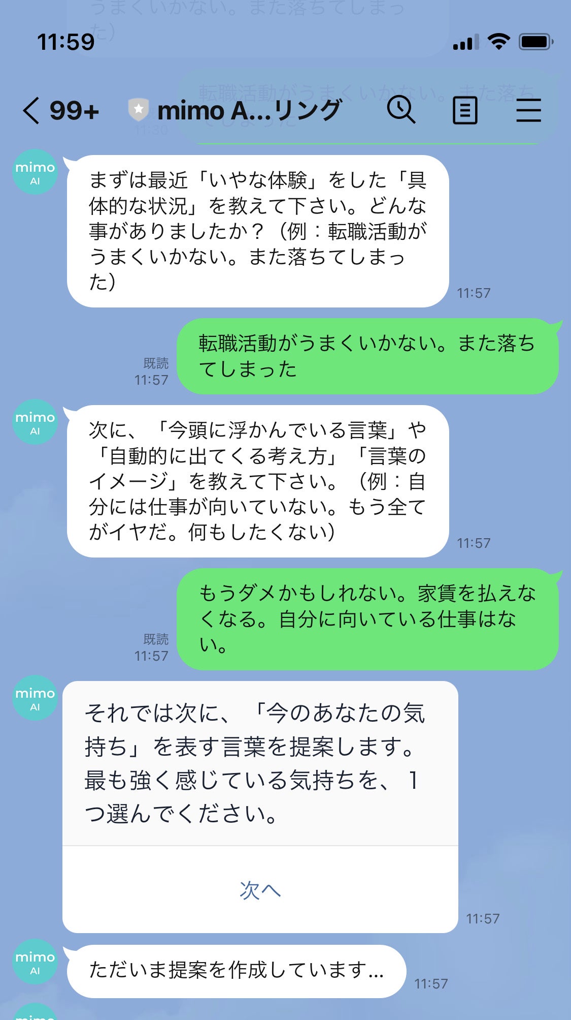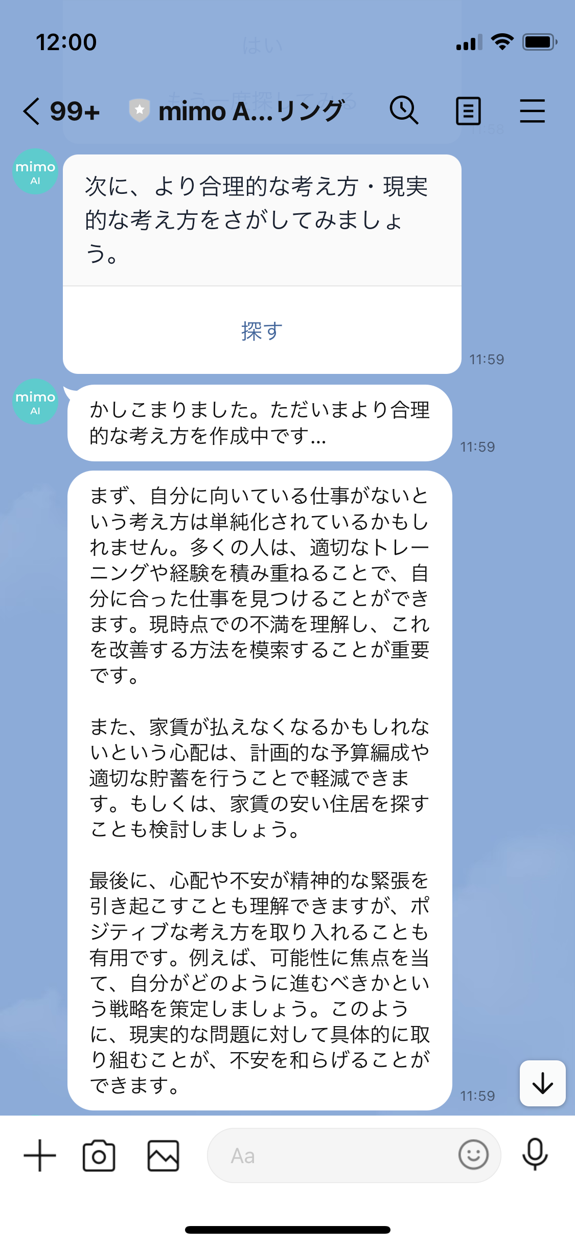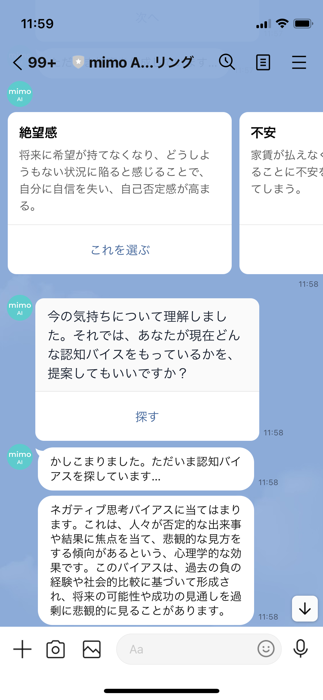 そこで、LINE上で、問題や悩みを具体的に記述さえすれば、あとはAIが「現在の感情」「自分の認知バイアス」「中立的な新しい考え方」を提案するmimo AIを開発いたしました。
