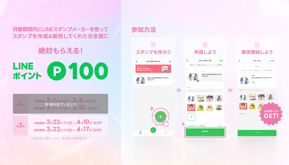 キャンペーン詳細URL:https://campaign.line.me/sticker/StickerMaker/spring/100ptCampaign.html