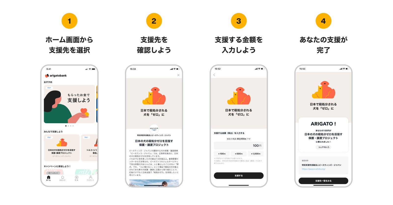 ARIGATOBANKは「お金に困っている人をゼロにする」のビジョンのもと、これまで様々な企画を行ってきました。その中でも寄付や支援企画はユーザーからの反響が大きく、非常に多くのご支援をいただいております。そこで、支援の輪をさらに広げるため、このたびピースウィンズ・ジャパン、ブリッジフォースマイルと提携いたしました。この提携によりARIGATOBANKは、提携団体を通じて1人でも多くの方に支援を届けてまいります。