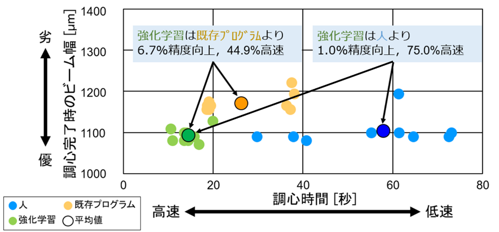 実際に製造工程で使用されるレンズの焦点を合わせる調心装置にAIプログラムを実装する形式で概念検証を実施したところ、AIが人や従来の制御プログラムよりも高速で高精度な動作を行えたことが確認できました。