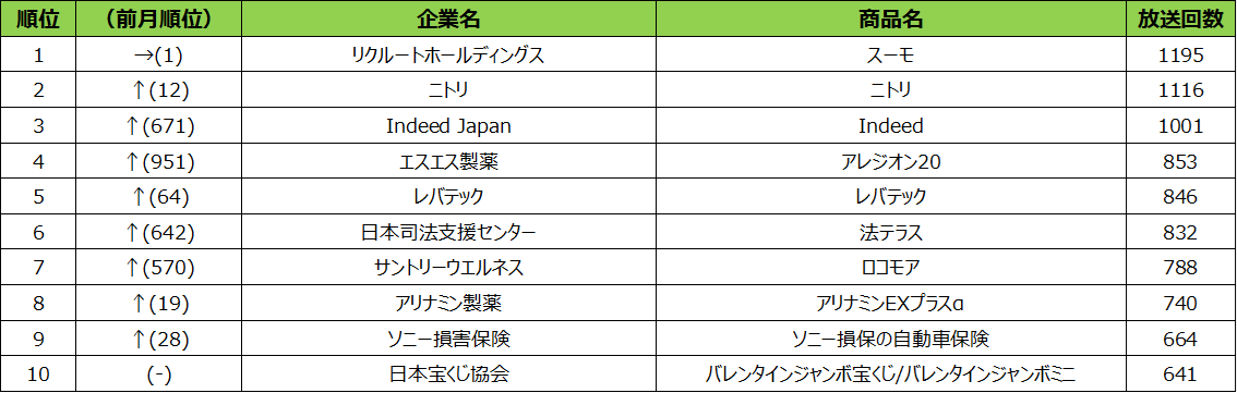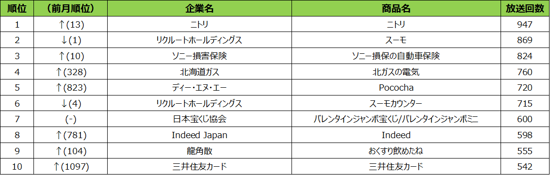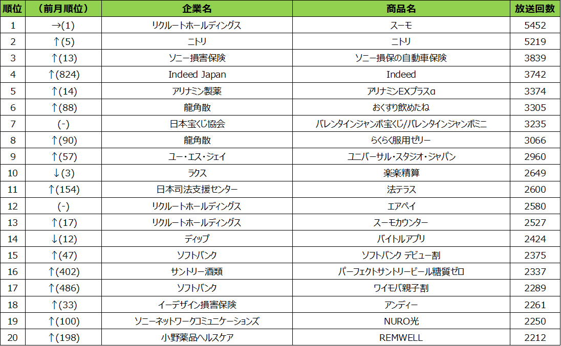 2023年2月度の商品別ランキングは、1位リクルートホールディングス「スーモ」、2位ニトリ「ニトリ」、3位ソニー損害保険「ソニー損保の自動車保険」。リクルートホールディングス「スーモ」は2023年1月度に続いての1位となりました。なお、ニトリ「ニトリ」は2022年7月度から、ソニー損害保険「ソニー損保の自動車保険」は2022年4月度から商品別ランキングにランクインし続けており、時季を問わずCM出稿量が多いといえます。