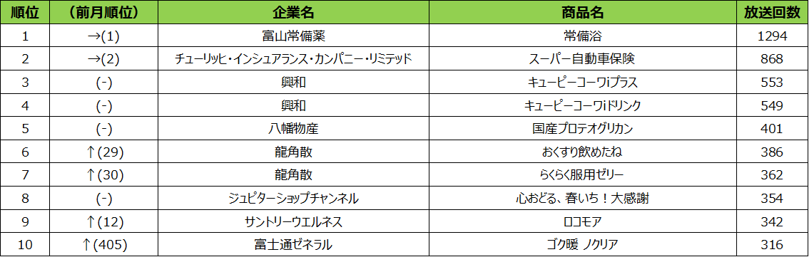 5位のアリナミン製薬「アリナミンEXプラスα」は眼精疲労や肩こり・腰痛の改善、20位の小野薬品ヘルスケア「REMWELL」は睡眠の質の向上に効くサプリメントです。季節の変わり目には体調を崩しやすいので、疲労回復をサポートし、不調を防ぐ商品のCM出稿が増えたと考えられます。