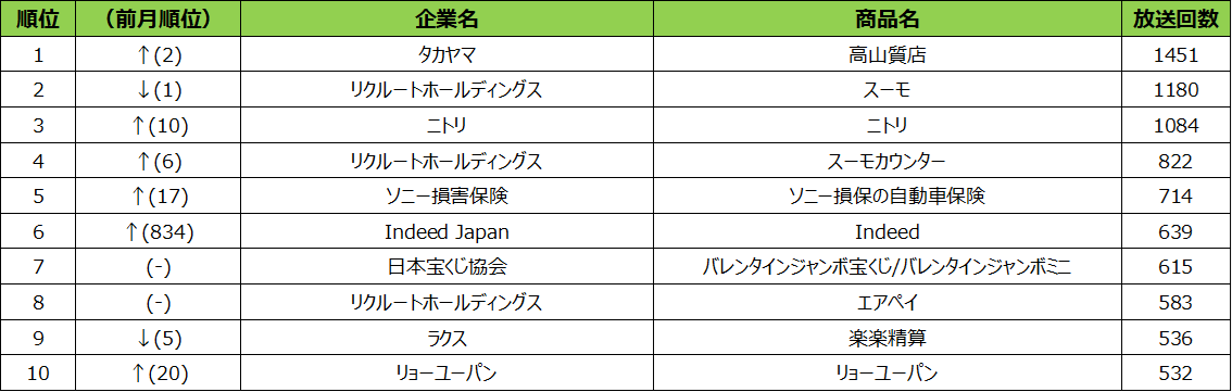 東京・大阪・名古屋・福岡・札幌のエリア別ランキングには、商品別ランキング1位のリクルートホールディングス「スーモ」、2位のニトリ「ニトリ」、3位のソニー損害保険「ソニー損保の自動車保険」、4位のIndeed Japan「Indeed」、7位の日本宝くじ協会「バレンタインジャンボ宝くじ/バレンタインジャンボミニ」の5つがランクインしており、全国的な大量出稿となっていることが見て取れます。また、福岡地区と札幌地区では、タカヤマ「髙山質店」、リョーユーパン「リョーユーパン」、北海道ガス「北ガスの電気」など、そのエリアならではのCMがランクインしました。