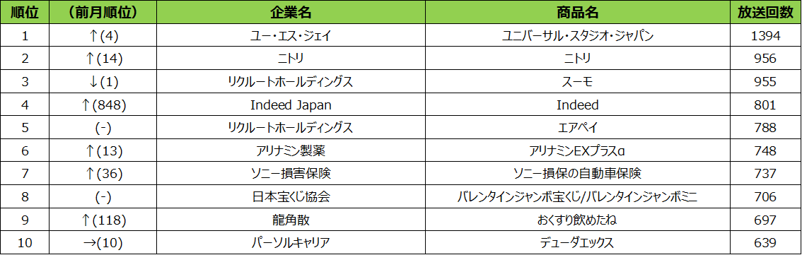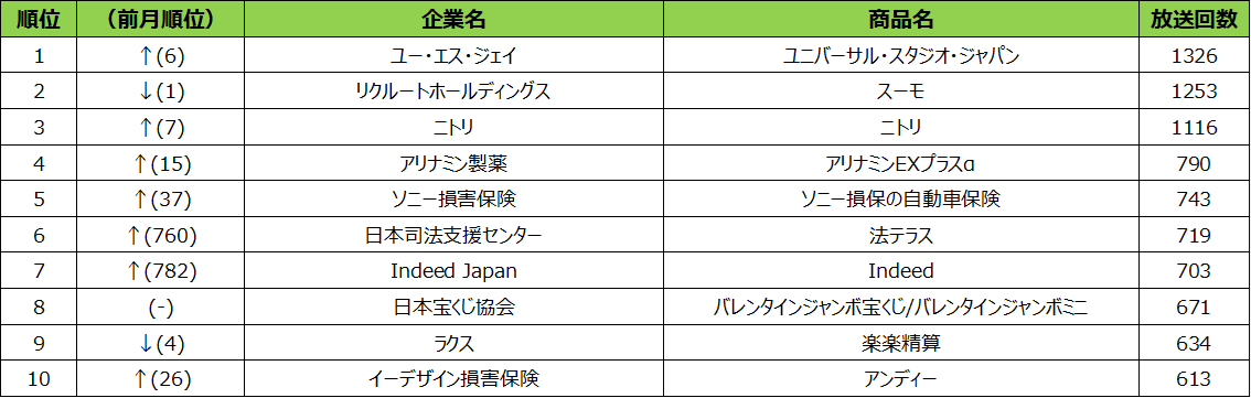 9位には、ユー・エス・ジェイ「ユニバーサル・スタジオ・ジャパン」がランクインしました。2021年2月度と2022年2月度の商品別ランキングにはアミューズメント施設のCMは入っていなかったことから、新型コロナウイルス感染症流行前の日常が戻りつつあることが伺えます。