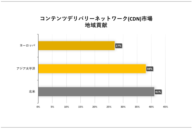 アジア太平洋地域は、予測期間中に20%程度の急速な市場成長が見込まれる地域です。アジア太平洋地域は、オンラインビデオコンテンツやゲームに対する消費者層が増加しているため、最も速い成長が期待されます。また、同地域のインターネット普及率は、近年大幅に拡大しています。例えば、2022年の同地域のオンライン人口は30億人と推定されています。また、日本におけるビデオコンテンツの消費者の68%は、ライブのテレビ番組を視聴していると推定されています。したがって、日本におけるCDNの需要は、予測期間中に増加傾向を示すと予測されます。ヨーロッパ地域もCDN市場で大きなシェアを占めると予想される地域のひとつです。幅広いインターネット普及率と、インターネットアーキテクチャや5Gインフラの開発への惜しみない投資が、この地域の市場成長を促進する主な要因となっています。2022年現在、インターネットに接続できるヨーロッパの世帯は、この地域の総世帯の94%を占めています。さらに、この地域のさまざまな産業におけるデジタル化も進んでおり、これが地域の市場成長につながると予想されます。