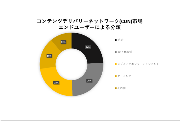 コンテンツタイプに基づいて、ダイナミックコンテンツタイプセグメンが予測期間終了までに最大の市場シェアを占めると予想されています。ダイナミックCDNは、2021年の市場において収益シェアの約61%を占めると見られています。ユーザーの興味、嗜好、行動に応じて変化するウェブコンテンツは、ダイナミックコンテンツと呼ばれています。ダイナミックコンテンツは、ユーザーに最も関連性の高い情報を提供します。したがって、ダイナミックCDNは、オンラインショッピングやビデオ、ゲーム、VoIP(Voice over IP)のライブストリーミングで大いに活用されています。2023年には、世界で約30億人がビデオゲームをストリーミングしていると推定されています。