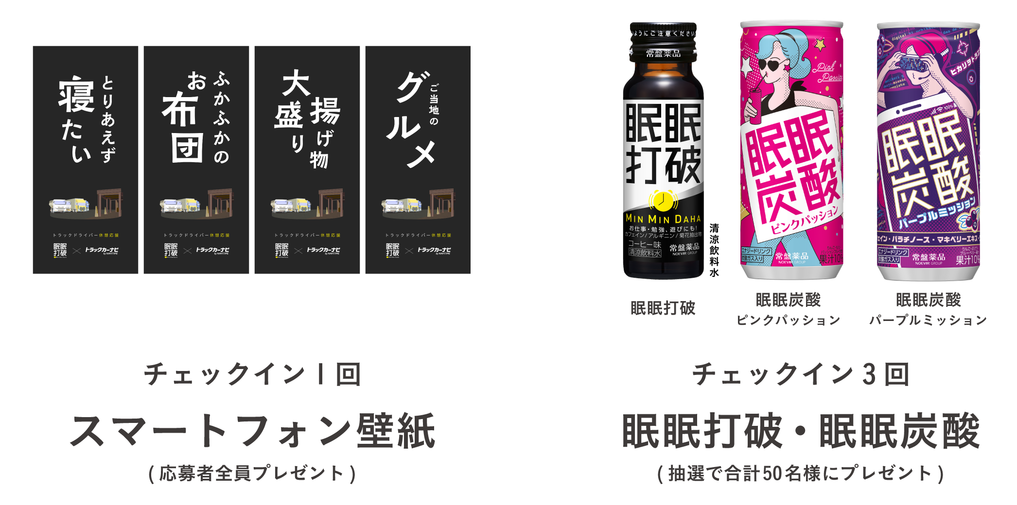 日本全国のサービスエリア・パーキングエリアにて、スマートフォンの位置情報をオンにし、キャンペーン期間中に『トラックカーナビ by NAVITIME』アプリ内のキャンペーンページからチェックインすると参加できます。5分以上滞在したと判定されると、チェックイン回数に応じて『眠眠打破』『眠眠炭酸』を抽選でプレゼントいたします。無料会員の方も応募いただけます。