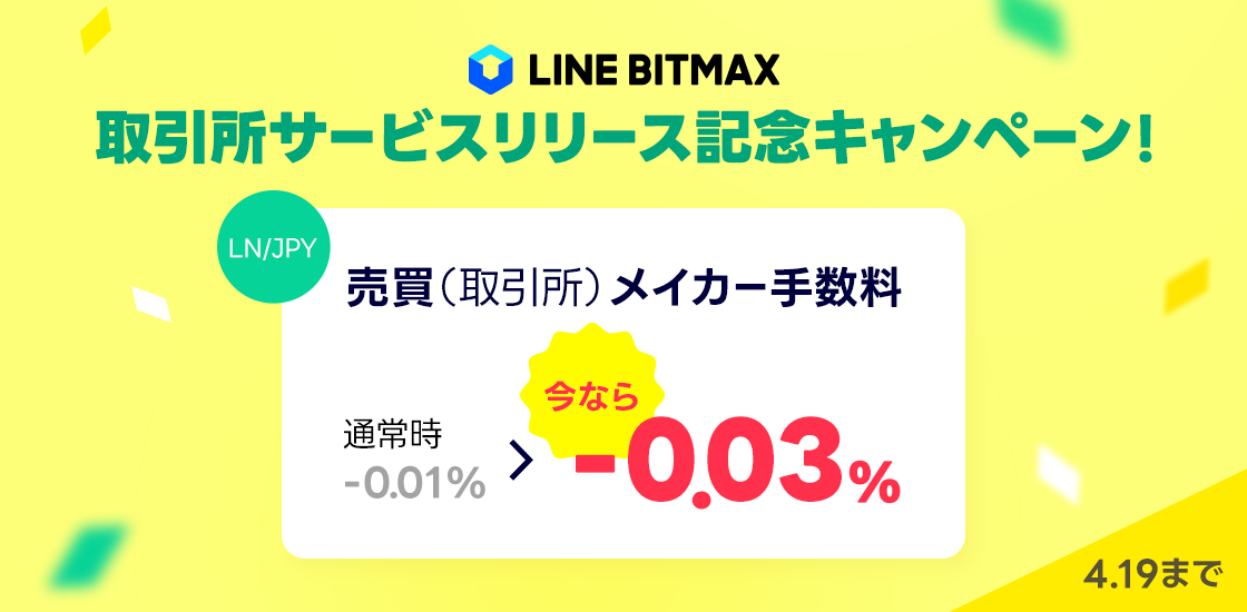 本日より30日間限定で、「取引所サービスリリース記念キャンペーン」を開催いたします。「LINE BITMAX取引所サービス」を多くの方にご体験いただくきっかけになるよう、通常0.01%のところ0.03%のメイカー手数料を受け取れるキャンペーンとなっています。(メイカー手数料「-0.03%」)