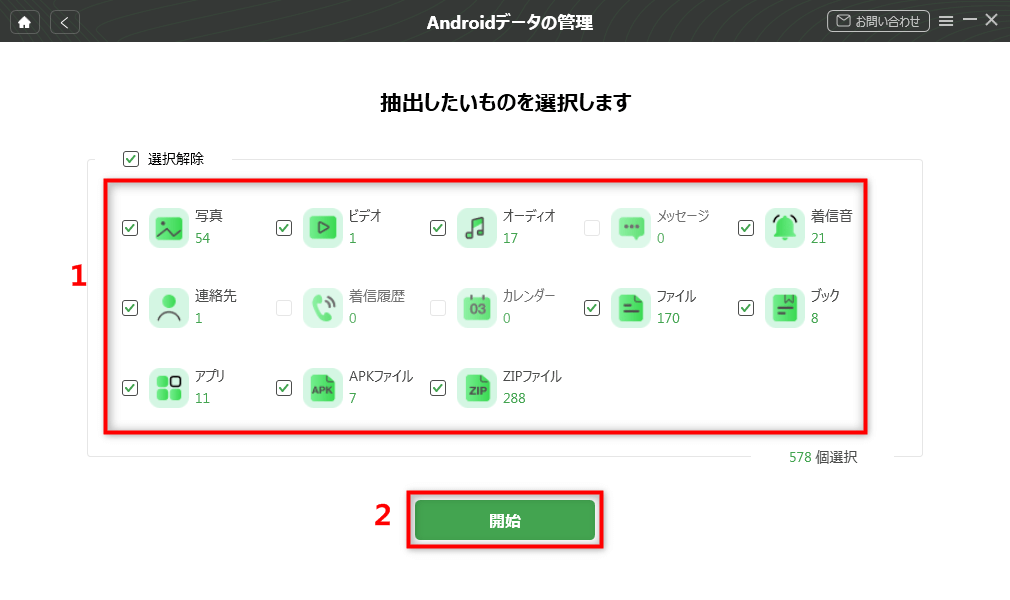 Step 3.Androidに保存しているデータが一覧表示されています。PCにバックアップしたいデータ、またはすべてのデータを選択してバックアップできます。