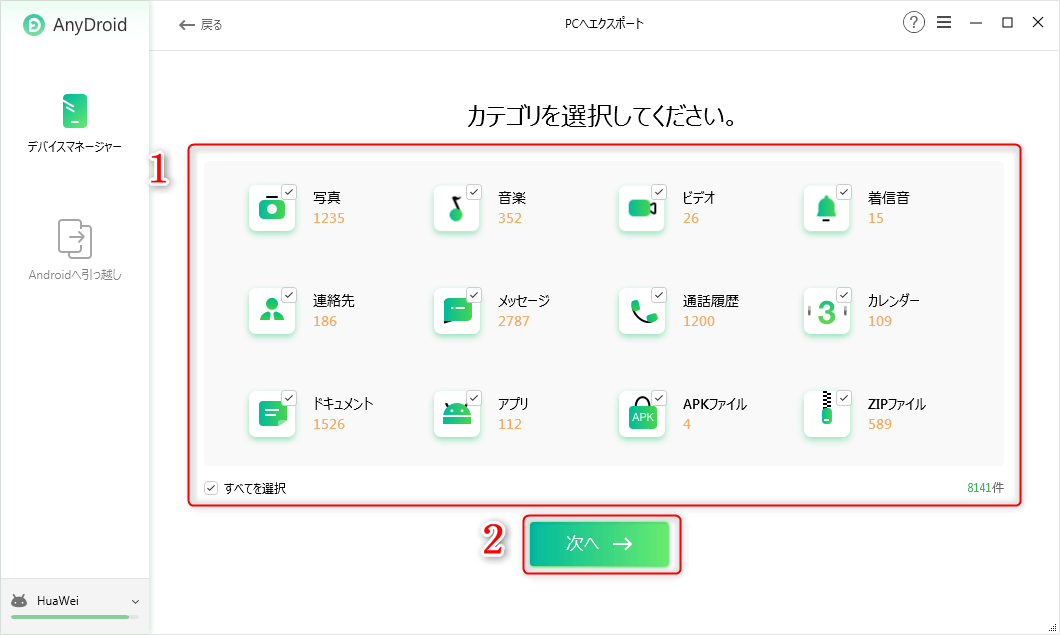 AnyDroidをダウンロードして起動します。「PCへエクスポート」ボタンをクリック > データ種類を選択 > 「次へ」ボタンをクリックしてデータをAndroidスマホからPCにバックアップします。