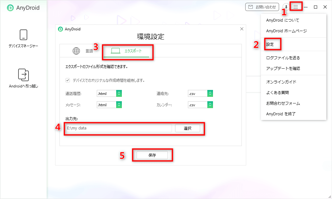 ご注意:Androidからパソコンにデータを転送してバックアップする前に、右上のボタンをクリックして「設定」を選択したら、「エクスポート」で出力形式と出力先を設定することができます。