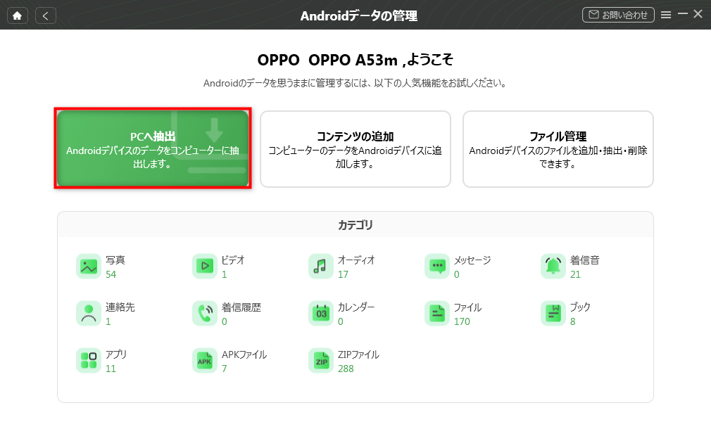Step 2.DroidKitは自動的にAndroidのデータを読み込みます。「PCへ抽出」をクリックします。カテゴリからデータの種類をクリックすると、プレビューして転送できます。