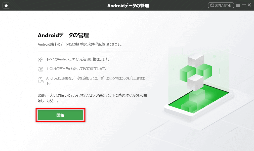 Step 1.DroidKitをダウンロードして起動します。ホームページで「Androidデータ管理」機能を選択して、「開始」ボタンをクリックしてください。