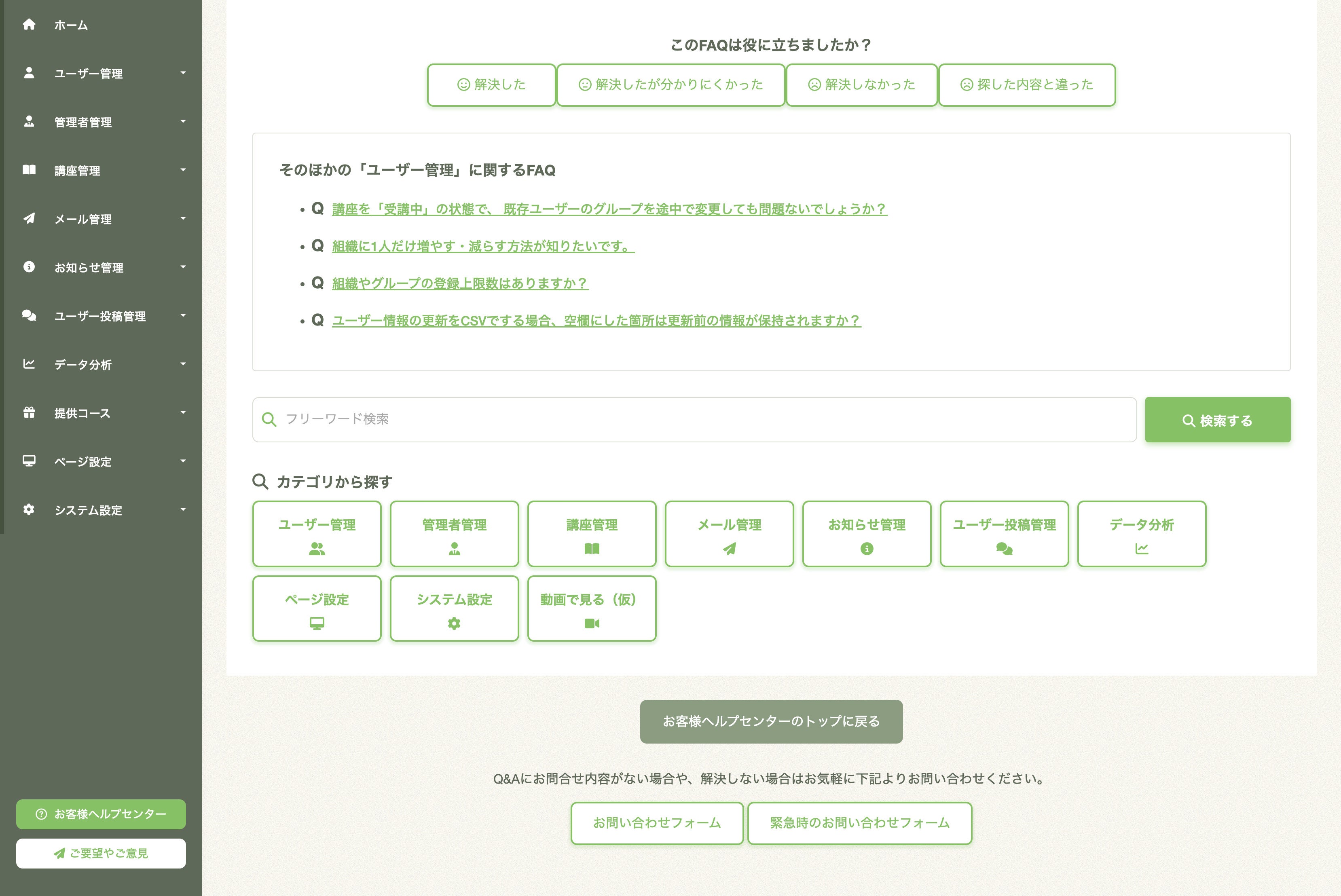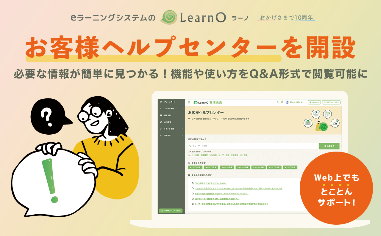 そんな10周年記念企画の一環として今回、「お客様ヘルプセンター」を公開しました。「お客様ヘルプセンター」とは、LearnOの管理画面に関する疑問や悩みを管理者ユーザー自身で解決できるように公開されたQ&A形式のWebマニュアルになります。