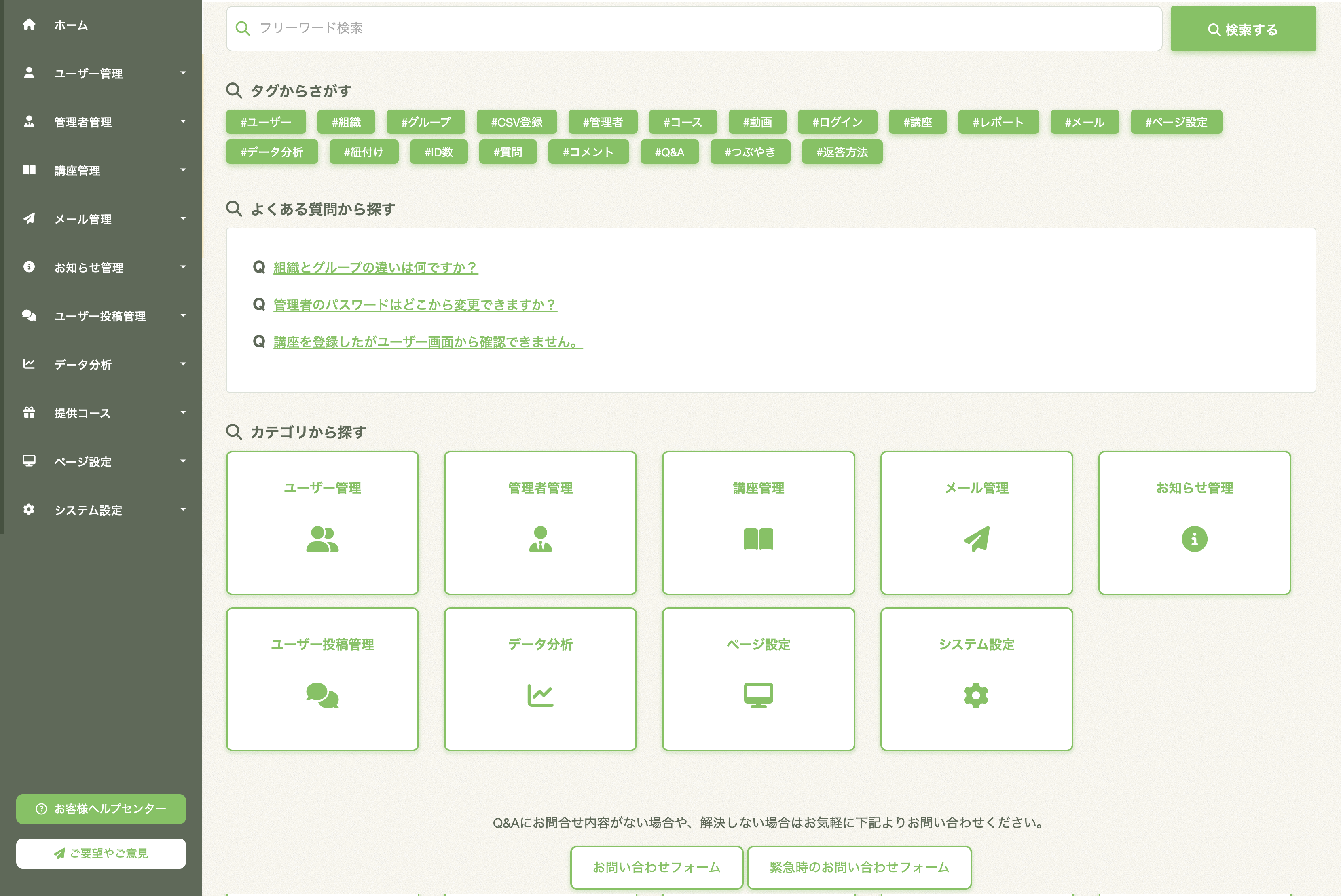 サービスを使用する際のヒントやチュートリアルをQ&A形式で閲覧できます。LearnOの機能や、サポートセンターに寄せられたよくある質問を抽出してまとめたものです。Q&A機能により、お客様のお問い合わせの手間が省け、ご自身で疑問や悩みを解決することができます。キーワード検索のほかに、カテゴリーやタグから探すことで必要な情報を簡単に見つけることができます。