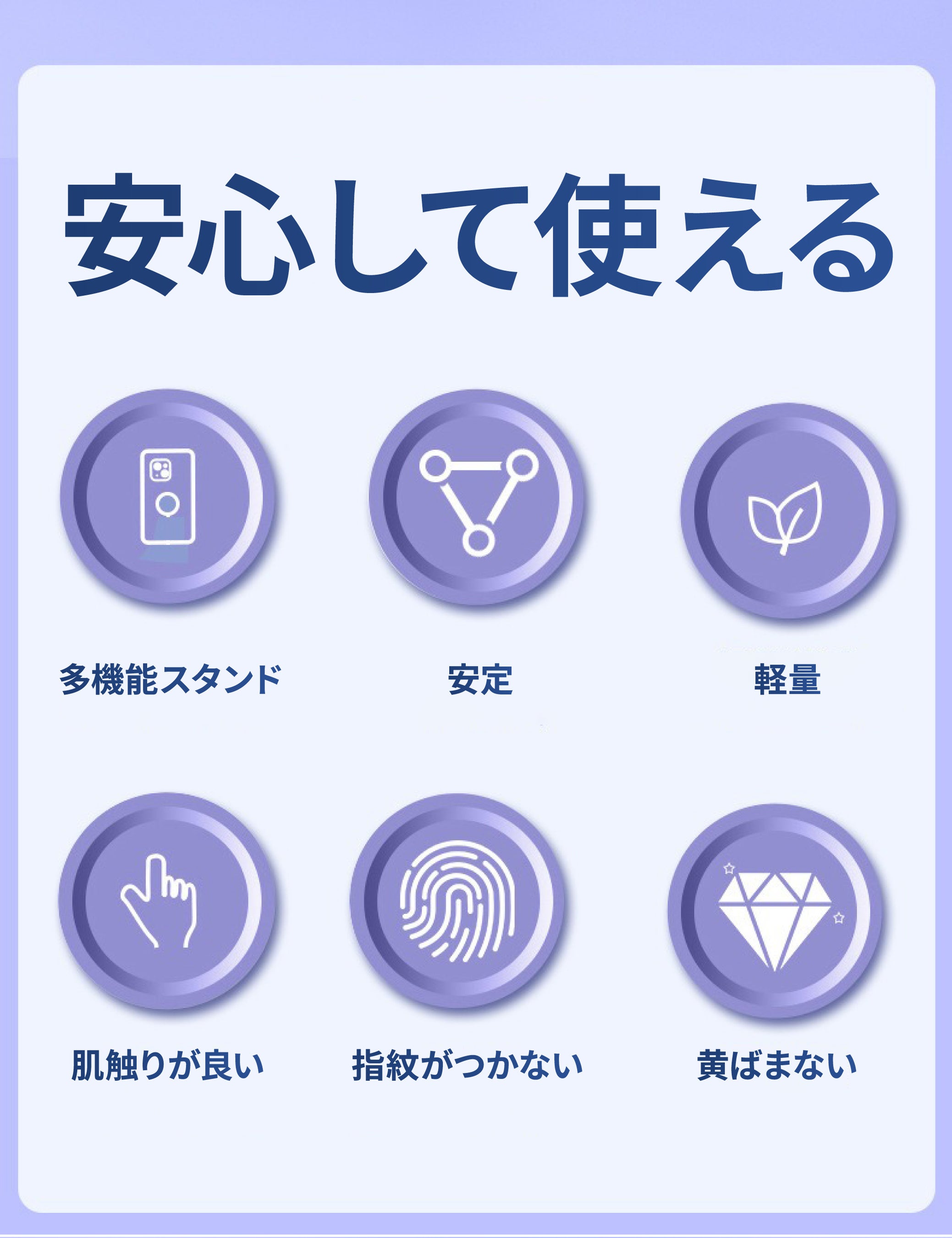 - 安心して使用できる設計:多機能スタンド・安定・軽量・肌触りが良い・指紋がつかない・黄ばまない