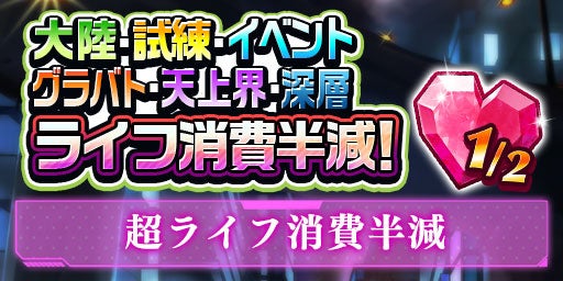 期間中、大陸・試練・イベント・グランバトル・天上界NORMAL・現代大陸深層で消費するライフが半減されます。