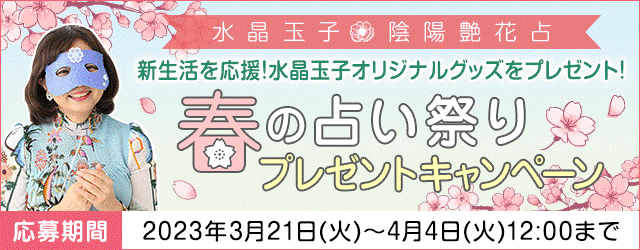 対象の鑑定を占っていただくと、抽選で3名様に新生活を応援する水晶玉子オリジナルグッズが当たります。 この機会をお見逃しなく!