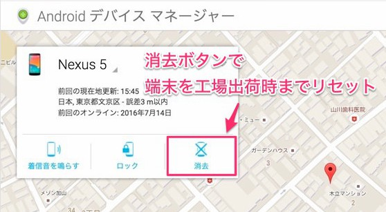 Step2:ロックを解除するAndroidを選択して「消去」を選択します。