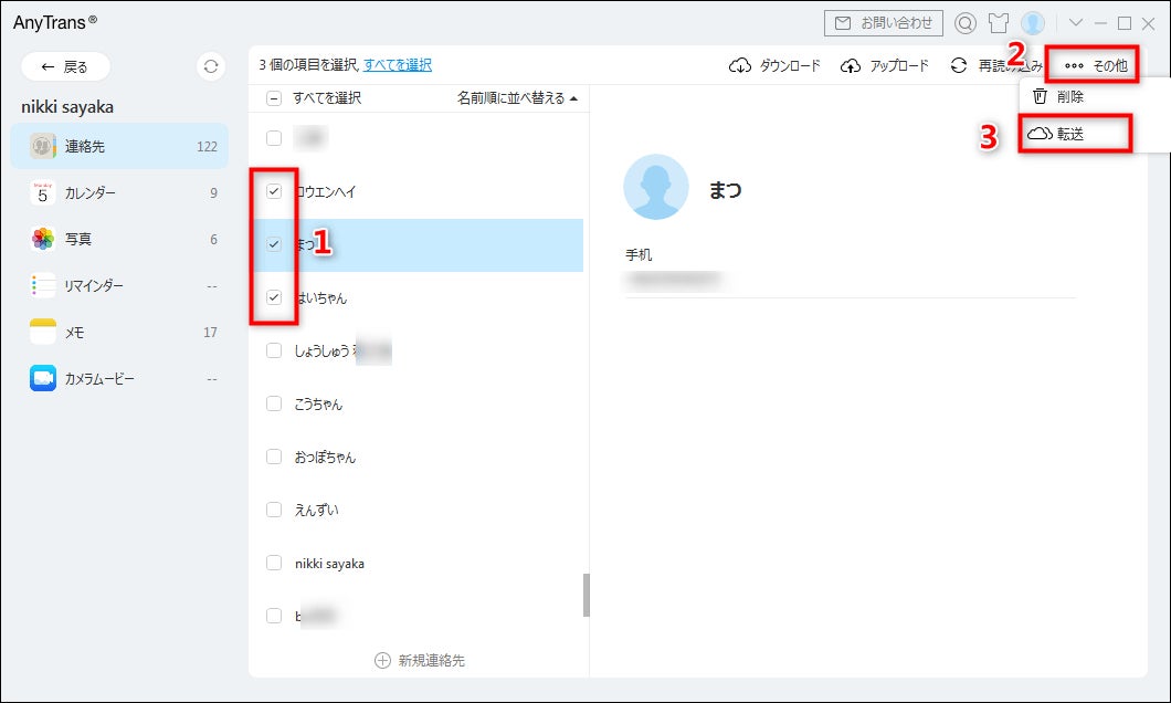 Step 3、必要なデータを選択して、右上の「転送」のアイコンをクリックします。しばらくすると、選択されたiCloudデータは「「新アカ」」に移行されます。