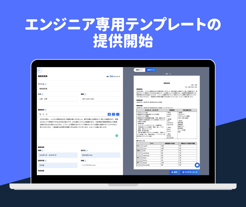 本日、話題のGPTを搭載した革新的なAI職務経歴書作成サービス【RESUMY.ai】を運営するChott.incは、一般職向けの職務経歴書テンプレートに加え、エンジニア向けの新たな職務経歴書テンプレートを追加したことを発表しました。これにより、エンジニアや技術者が、自分のスキルや経験を効果的にアピールできる職務経歴書を、短時間で簡単に作成できるようになります。